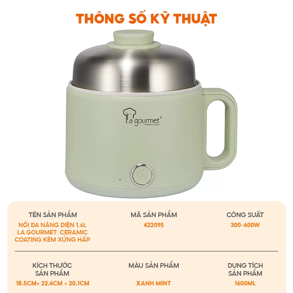 La Gourmet 1.6L Multi Cooker phiên bản Mint Green là lựa chọn hoàn hảo cho gia đình nhỏ, sinh viên hoặc nhân viên văn phòng. Với dung tích 1.6L, sản phẩm cho phép bạn nấu cơm, nấu mì, hầm súp, hâm nóng hay hấp rau củ và hải sản chỉ trong một thiết bị duy nhất. Thiết kế tinh tế, màu xanh Mint trẻ trung giúp không gian bếp thêm phần hiện đại và gọn gàng.